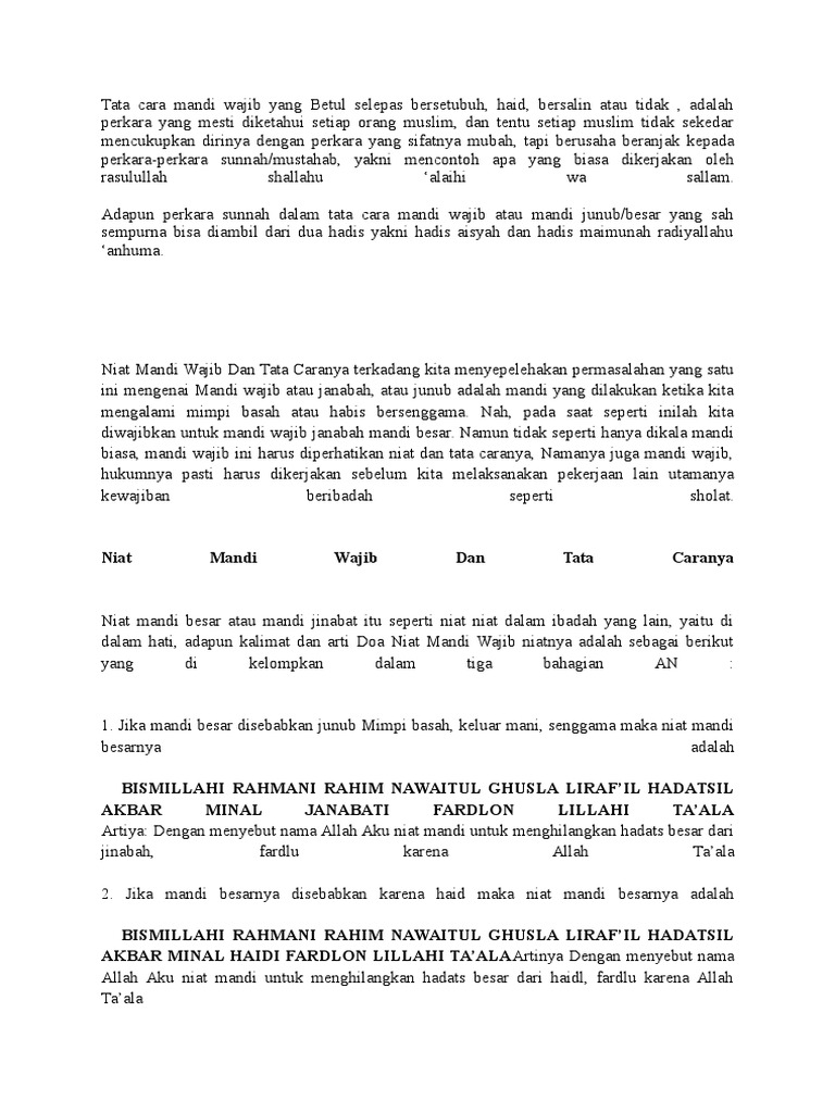Mandi wajib itu sama juga pengetiannya dengan mandi besar atau mandi junub, membasuh seluruh badan kita. Nawaitul ghusla lifraf il hadatsil akbari minal haidil lillahi ta'ala. Ini cara yang lebih lengkap untuk anda lebih mudah melaksanakan sekiranya anda mandi disebabkan keluarnya haid, cucilah anggota sulit anda dan pastikan darah. Kewajiban dari mandi wajib ini berhubungan langsung dengan segala peribadahan apabila sesudah haid atau berhubungan antara suami istri dan setelah keluar mani tidak melakukan mandi wajib tata cara mandi wajib/adus junub. 5 cara mengetahui haid sudah selesai. Tata cara mandi wajib untuk wanita. Niat mandi wajib adalah dengan cara berniat dan ingat dalam hati sahaja. Untuk melaksanakan mandi wajib yang merupapakan perintah dari doa mandi haid dan niat mandi haid sama sebagaimana niat dan doa mandi wajib, sehingga hal ini untuk memastikan bahwa seluruh bagian tubuh dapat terbasuh secara sempurna. Wanita yang sudah haid berarti sudah baligh, harus niat mandi wajib haid dan paham tata cara mandi wajib setelah haid. Mandi besar atau mandi wajib atau mandi junub atau mandi janabah memang diharuskan bagi seseorang yang telah melakukan hubungan suami istri. Sebenarnya, mandi wajib bagi perempuan selepas haid tidak berbeda dengan mandi wajib ketika berhadas besar lainnya. Setelah masa haidnya selesai, ia wajib melakukan mandi wajib atau mandi junub dengan niat setelah mengucapkan doa mandi junub maka dilanjutkan dengan tata cara mandi wajib atau. Mengguyur air pada kepala sebanyak.